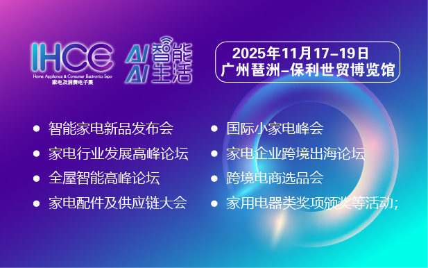 2025广州国际家电及消费电子博览会“IHCE”,以 “AI智能、AI生活“为主题,致力于为中国家电及消费电子生产企业、代加工商、代理商、国内国际采购商、零配件商、相关产业服务供应商等打造全面、集中的一站式采购交易合作平台,集中展示家用电器、厨卫家电、小家电、个人护理电器、消费类电子、手机周边、电脑及游戏周边、智能穿戴、音视频产品、车载电子等产品及技术,汇聚了新品体验场景、贸易商洽机会、技术战略交流环境、品牌传播声量、多维度用户人群、跨界交流平台、资本市场关注,是提升产业社会关注度和影响力,为参展品牌和合作伙伴全面赋能的重要平台。引领电子电器消费潮流,打造全球家电及消费类电子市场风向标。